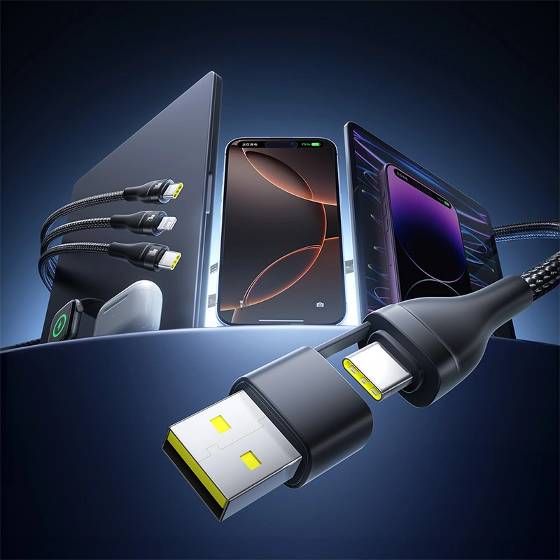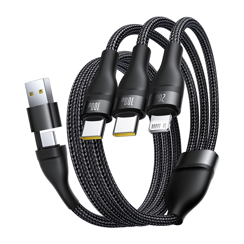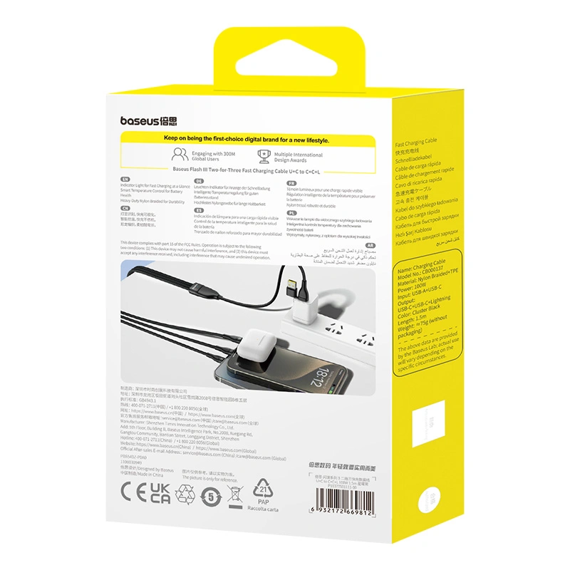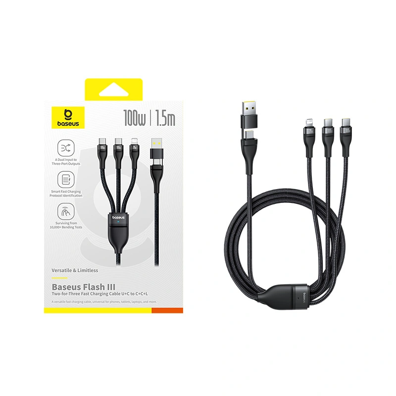 The Baseus Flash Series 3 Two-for-Three Charging Cable is designed for ultimate versatility, allowing you to charge multiple devices from a single cable. With 100W fast charging support, this 1.5-meter cable is ideal for smartphones, tablets, and laptops. Its durable Cluster Black braided design ensures long-lasting performance.