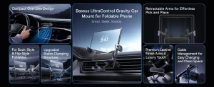 The Baseus UltraControl Gravity Car Mount for Foldable (Model C40483401813-00) offers a sleek and intelligent mounting solution for today’s foldable smartphones. With auto-clamp convenience, high-quality build, and stylish finish—it’s a strong choice for your in-car phone setup.